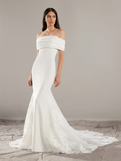 sample SALEMermaid wedding dress in crepe with lace detail skirt and a detachable Bardot wrap, by Pronovias.