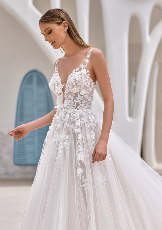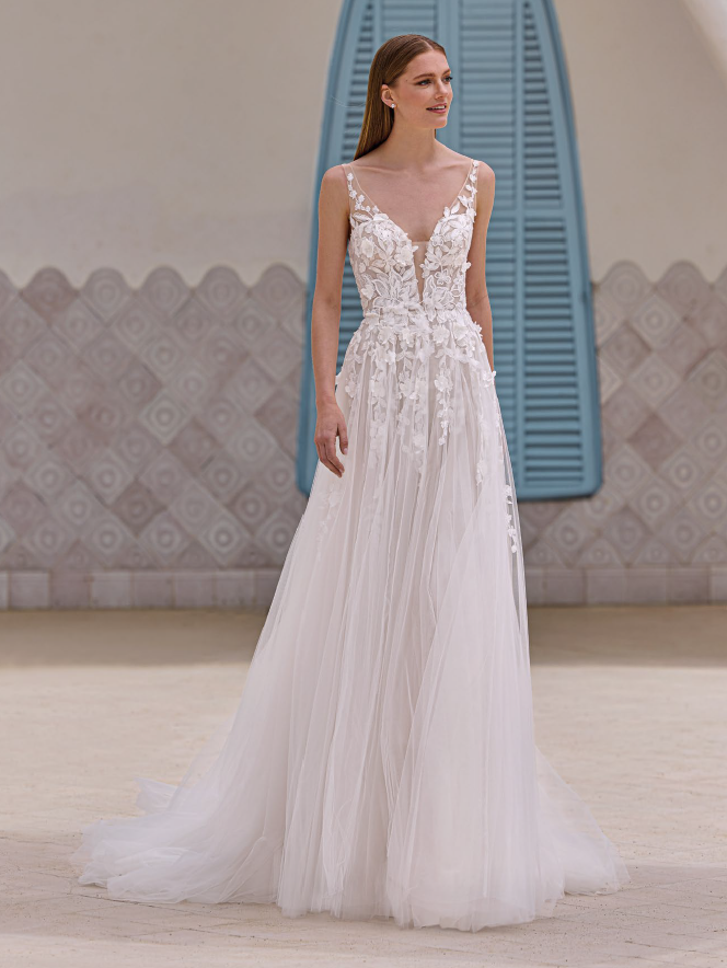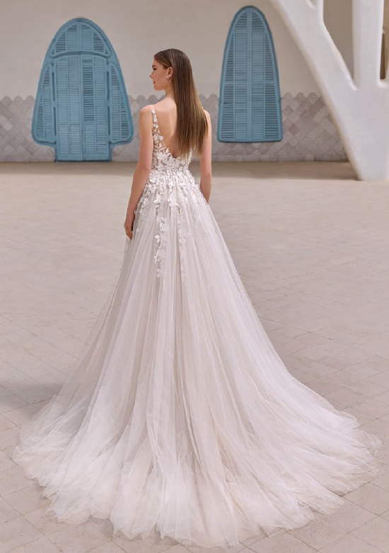 This flowing A-line dress with a V-neckline and V-back glides naturally, wrapping the figure in tulle and lace. The silhouette is light and romantic, ideal for an intimate or outdoor celebration.