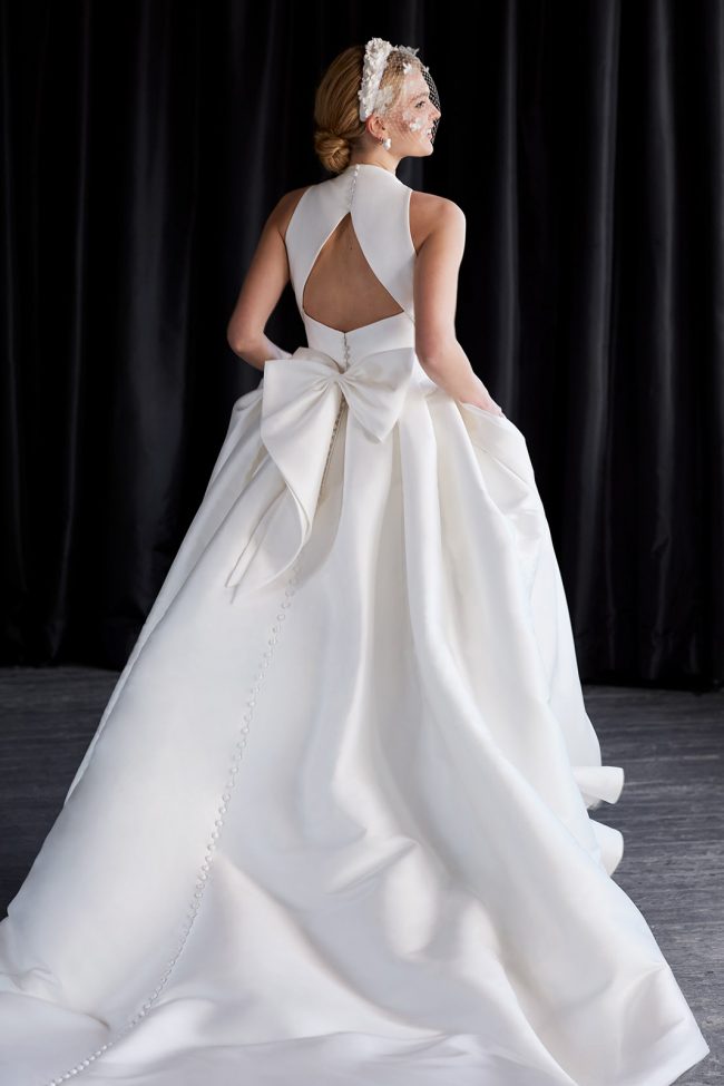 Mikado satin racer neck ball gown with pockets and keyhole back, by Ellis.