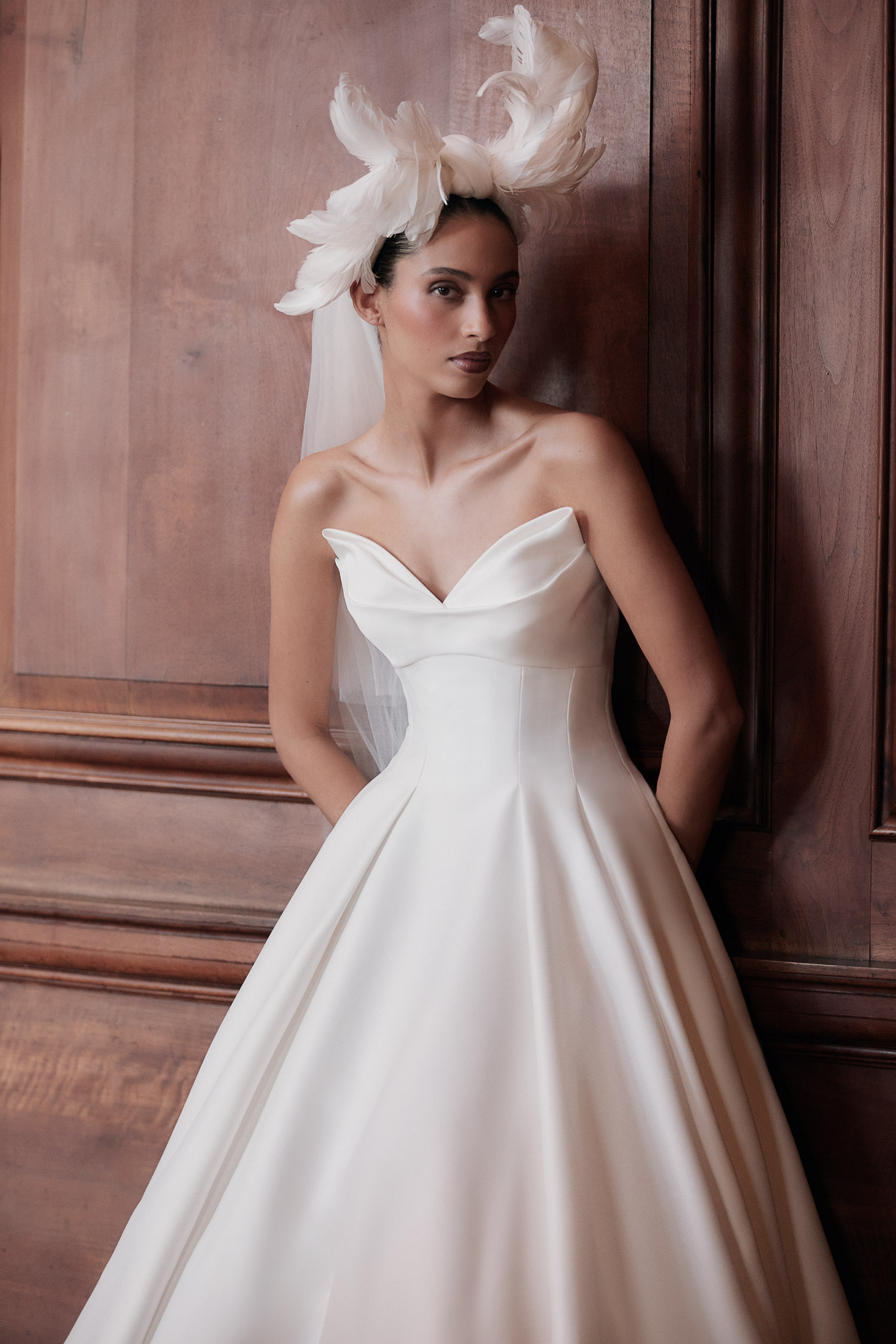 Bold and unforgettable, Etta commands attention in textured Mikado. Her sharply sculpted pointed neckline and structured bodice provide architectural elegance, supported by an internal corset for flattering shape. Princess seams and a dramatic, flowing skirt elongate the figure, creating a gown that is both striking and graceful. Etta is designed for brides who embrace confident, statement-making style while maintaining refined sophistication.