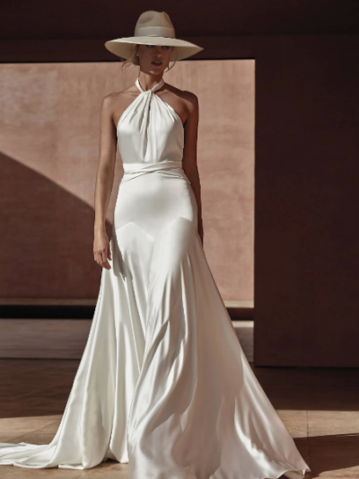 Strapless neckline A-line wedding dress in mikado featuring a pointed asymmetrical neckline and a daring thigh-high slit with an attached overskirt for a spectacular two-piece effect.