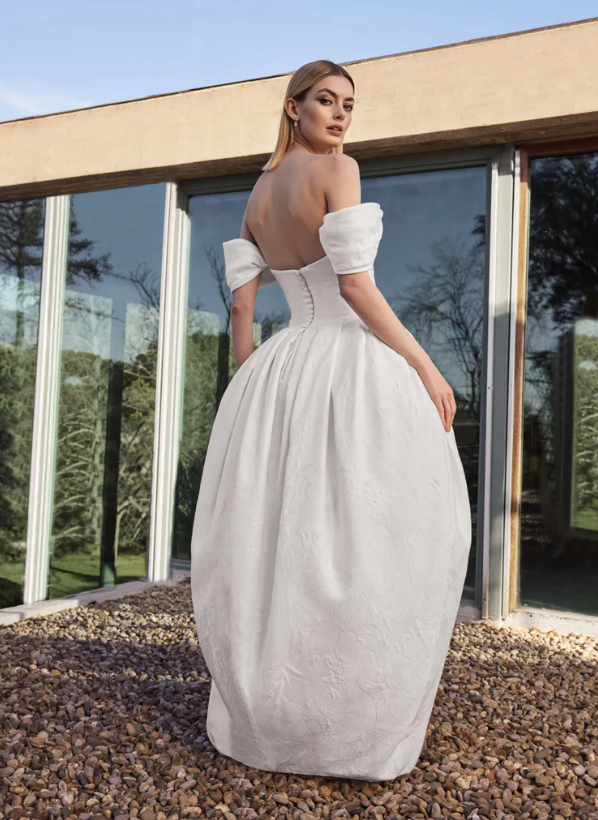 Wedding dress with a princess silhouette and a sweetheart neckline, crafted in jacquard for a commanding, romantic presence combined with modern sophistication.